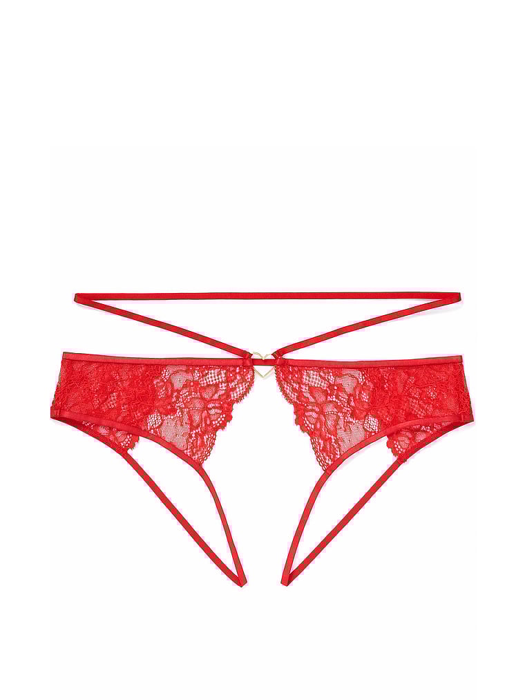 This bold crotchless panty is made for sultry nights, thanks to strappy details and heart-shaped hardware.