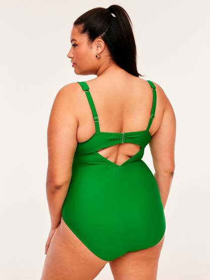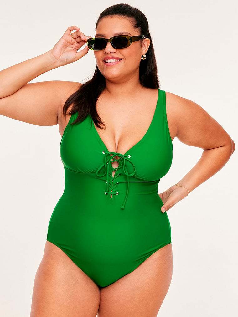 With a chic, plunging neckline, lace-up detail, and comfortable straps this one-piece brings a little edge to your beach-ready style.