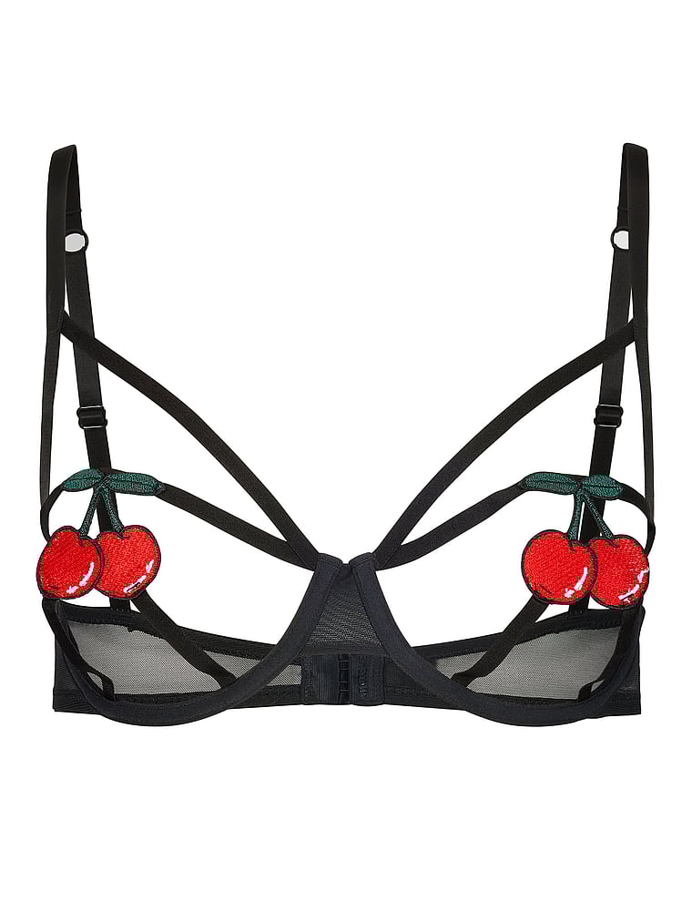 The elastic strappy cups are adorned with sweet cherry motifs. The underwire provides support, while the back adjustable straps and hook and eye closure ensure a secure fit.