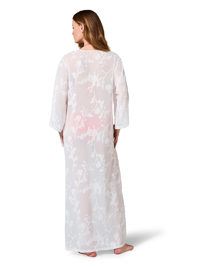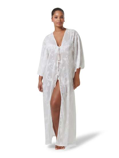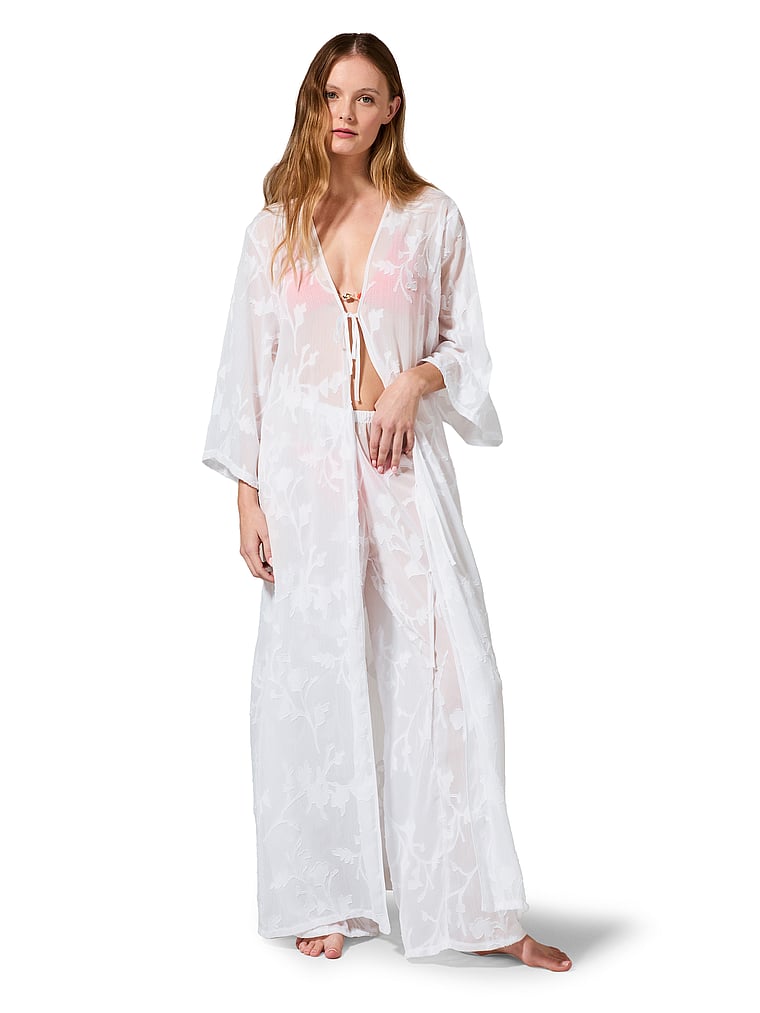Crafted from a semi-sheer floral jacquard, this breezy Kaftan features front-tie details and flowing, mid-length sleeves so you can look chic while going from the hotel pool to the hotel lobby (and back again). Pair with the Darla Trouser for a matching look.