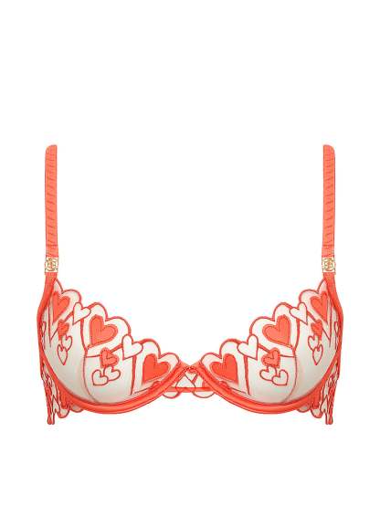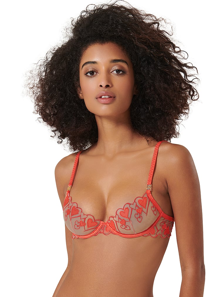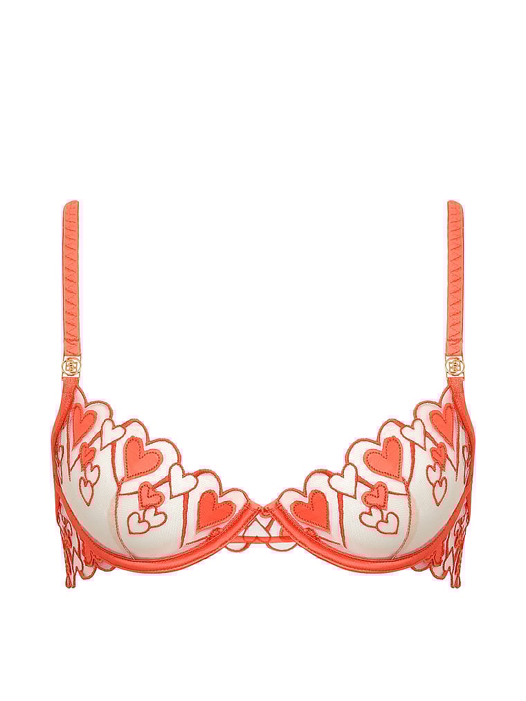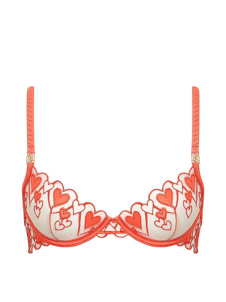 Romantic and feminine, this bra features delicate heart embroidery atop sheer mesh fabric. Elegant scalloped edge trims detail the underwired cups, with adjustable grosgrain straps and signature metalwork.