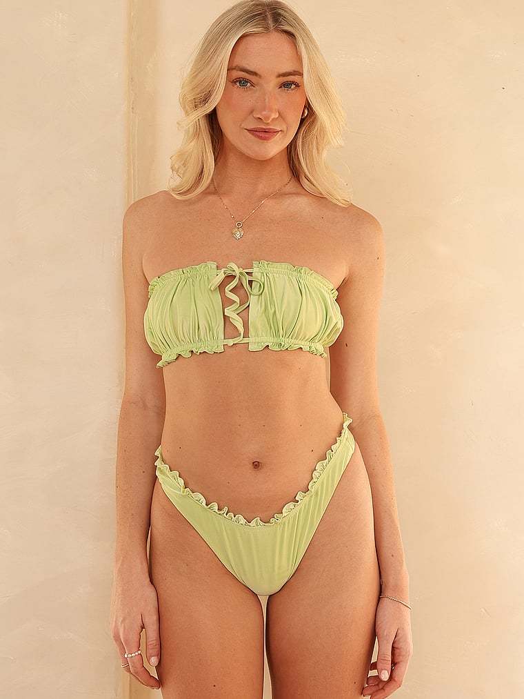 This adjustable bandeau Bikini Top has cutouts, ruffled trims, and a sexy open back.