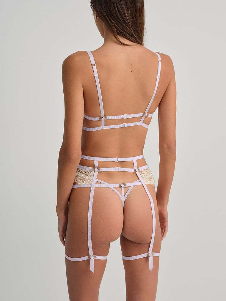 Soft, feminine style. This garter belt is crafted with intricate lace and contrast pastel ruffled trims. This high-waisted design features flirty cutouts at the sides, an open cage back, and romantic rosettes throughout.