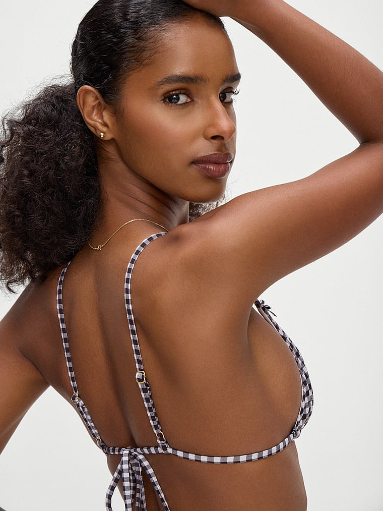 With its triangle shape, specialty lace detailing, textured fabric, and gingham pattern, this one's a top-choice addition to your swimwear collection. By Frankies Bikinis.