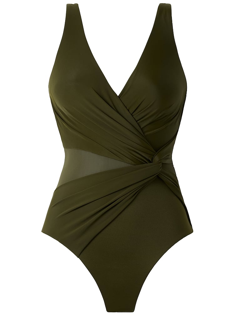 This sleek One-Piece is cut from a slimming compression fabric that flatters your curves, with a v-neck, crossover detailing, and Miratex fabric that provides allover body control.