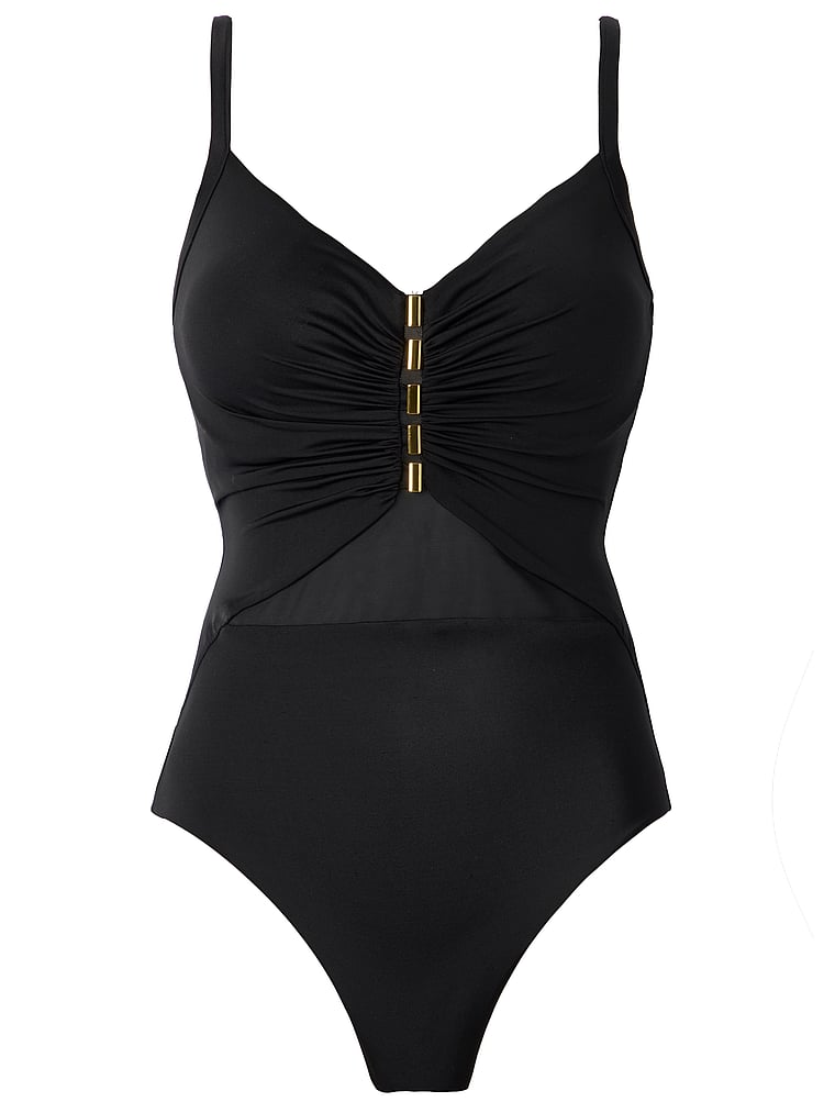 Slimming and sexy, this One-Piece bathing suit has an underwire bra for support, v-neckline, and adjustable lingerie straps for the ideal fit. A center-front hardware detail adds an hourglass effect.