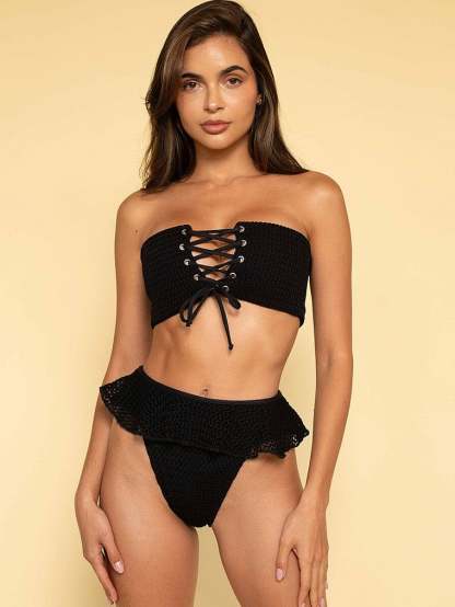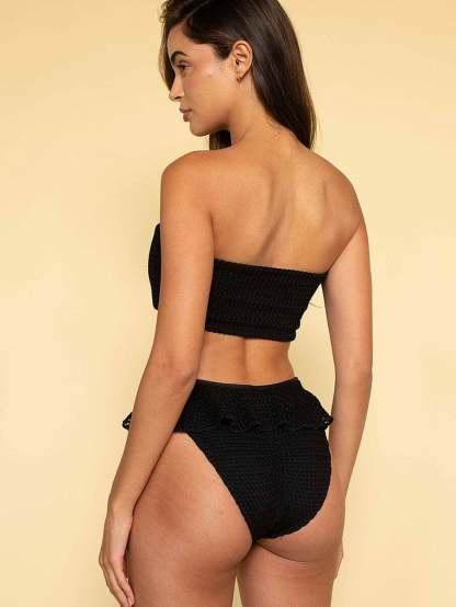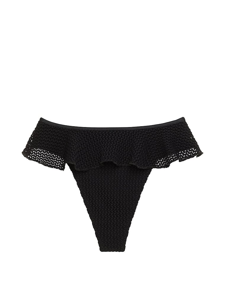Frills thrill on this high-cut bottom, with playful ruched back and ruffled skirt.