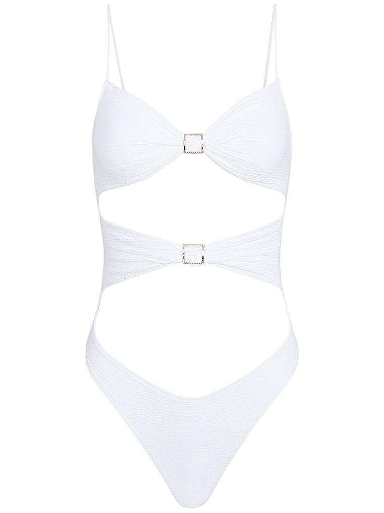 High-cut legs elongate your figure, while twisted cutouts and gold hardware give this sun-kissed one-piece a glamorous feel.