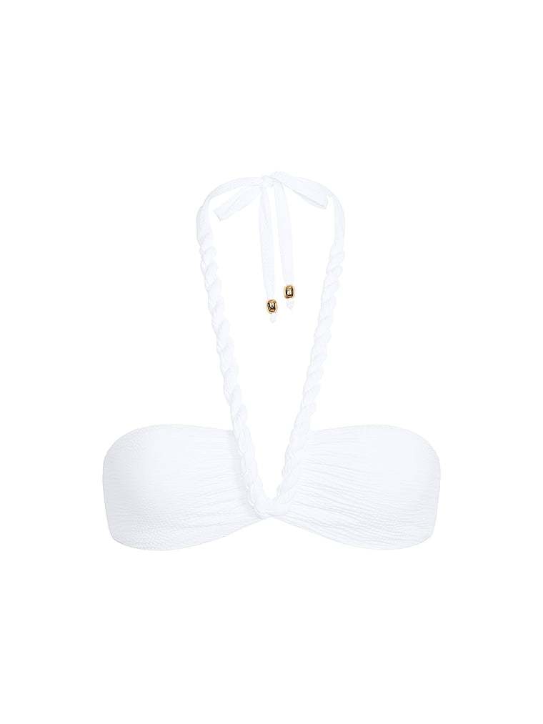 - Twisted self-tie halter straps with gold bead details