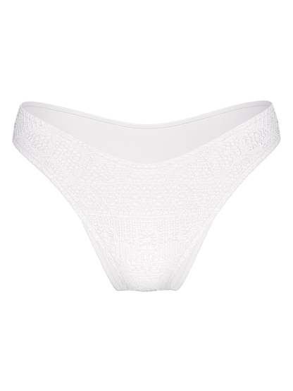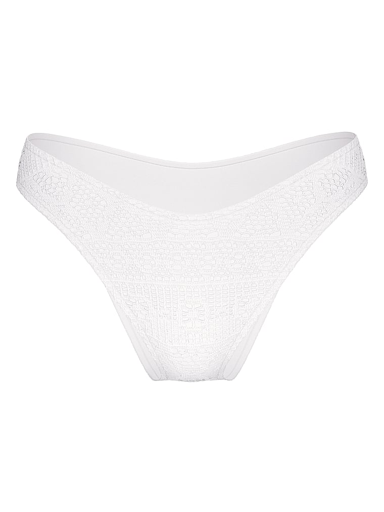 The allure of lace finds its place in the sun with this inspired collection. Here, a minimal Brazilian style is complete with a sexy, dip-front design.